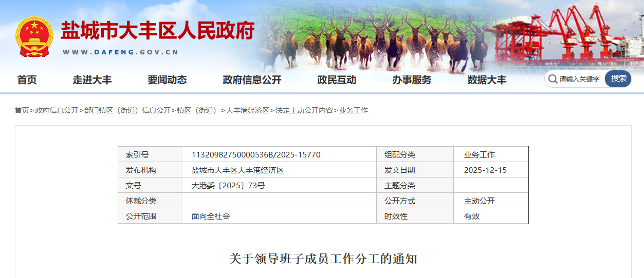 盐城一区领导班子成员工作分工的通知